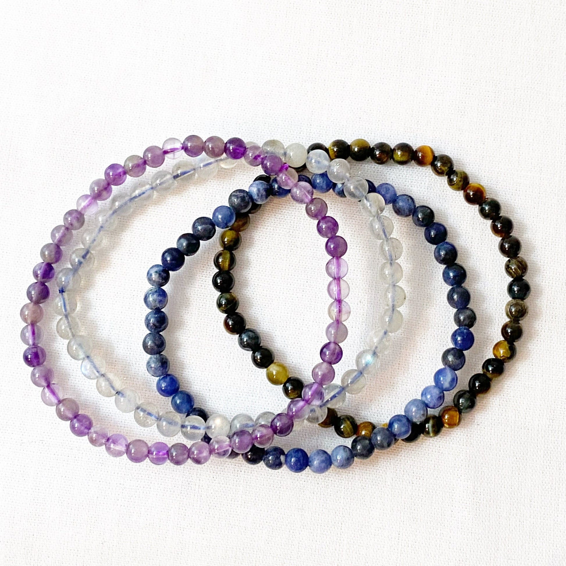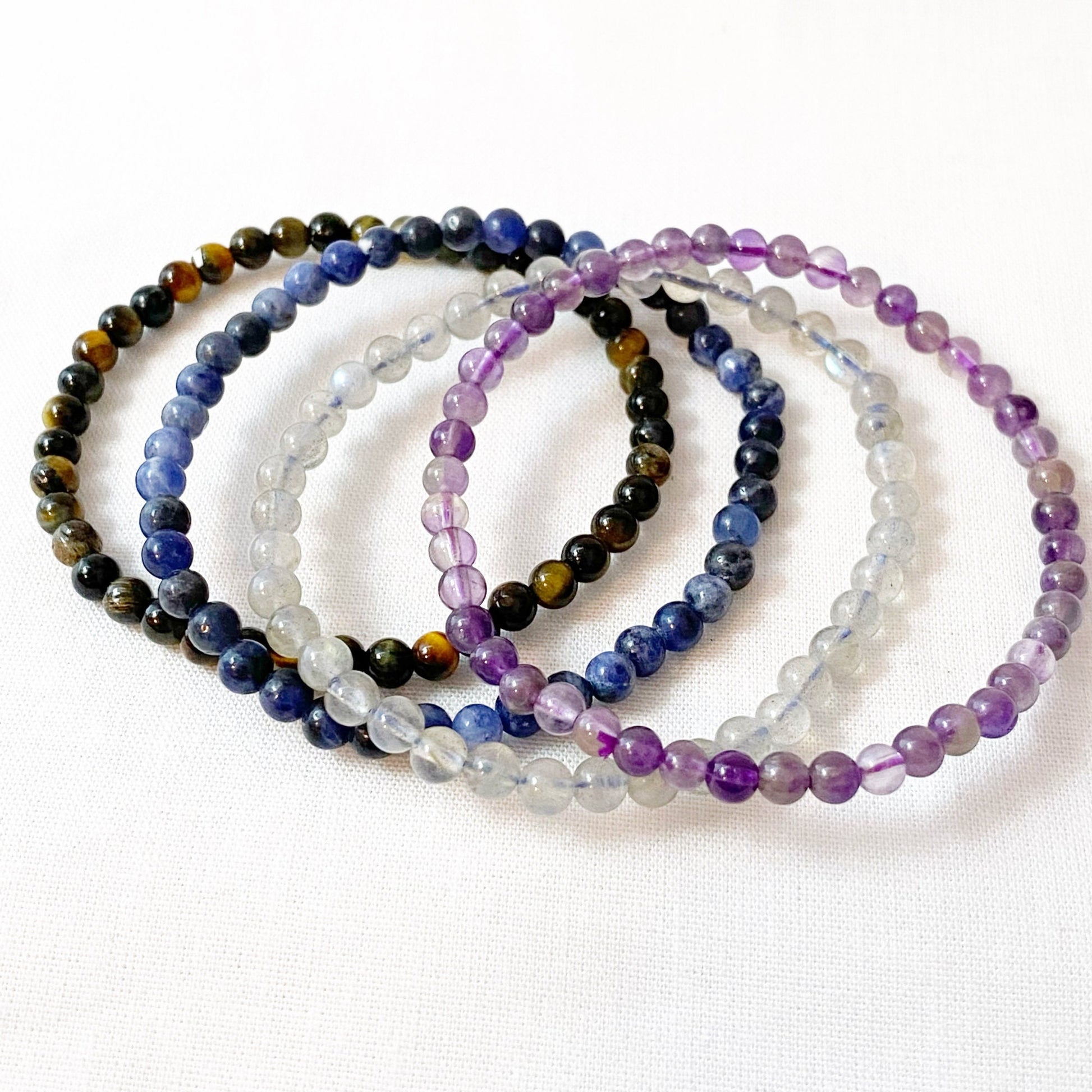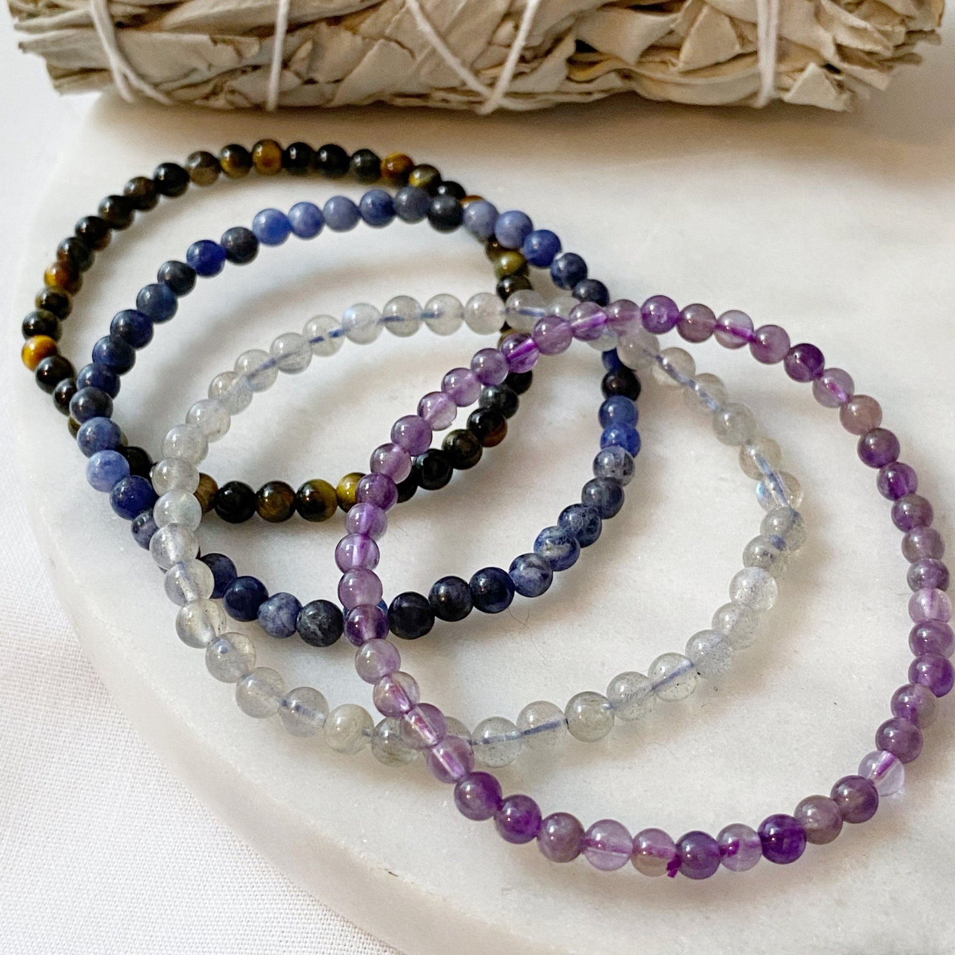 Includes one (1) each of the following gemstone bracelets: Amethyst, Blue Labradorite, Sodalite, and Blue Tiger Eye 4mm bead energy bracelets infused with Usui Reiki energy, love, and light. These fit-size S-M wrists.