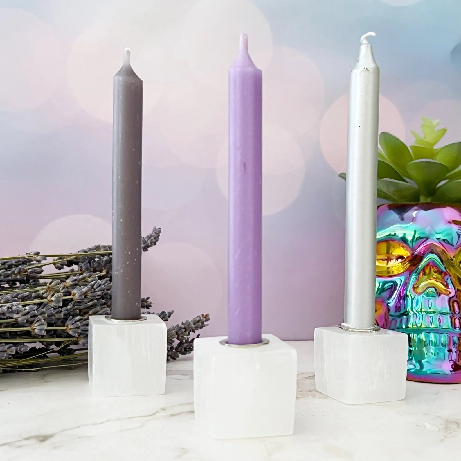 These Mini Selenite Cube candle holders are designed to accommodate Chime Spell Candles measuring 4" to 5" in height and .5" in width only. Each square piece is naturally shaped and polished to highlight the individual character of the selenite, ensuring that no two holders are exactly alike - size and shape may vary.