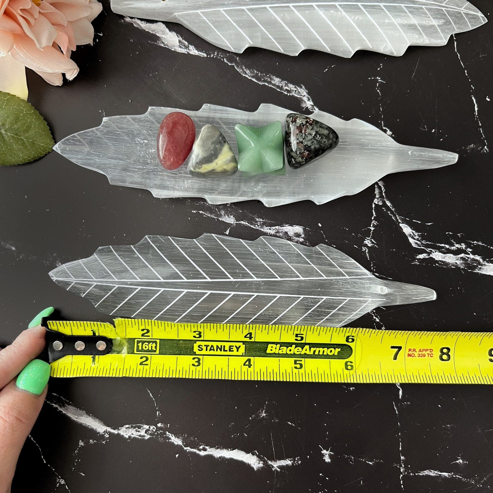 Welcome this beautiful Selenite Feather Incense Holder into your sacred space - a versatile, functional, and stunning piece! Handcrafted with care, each holder measures approximately 7.5 inches long and 2 inches wide, making it the perfect size for any space. You will receive 1 (one) selenite feather intuitively selected for you. Please note these do not sit flat/flush with the surface.
