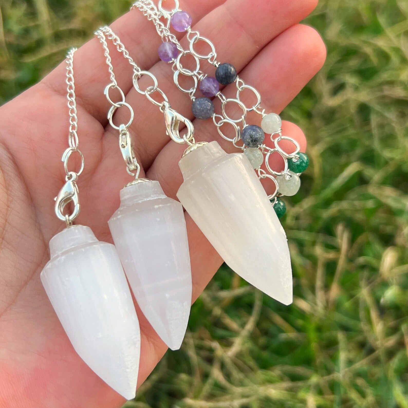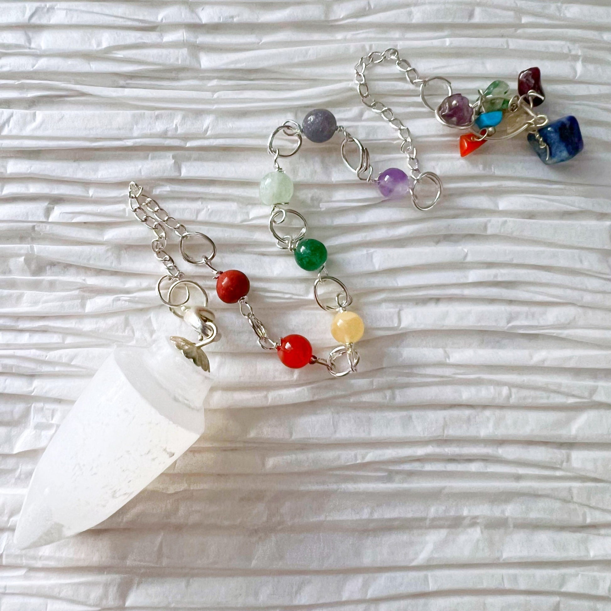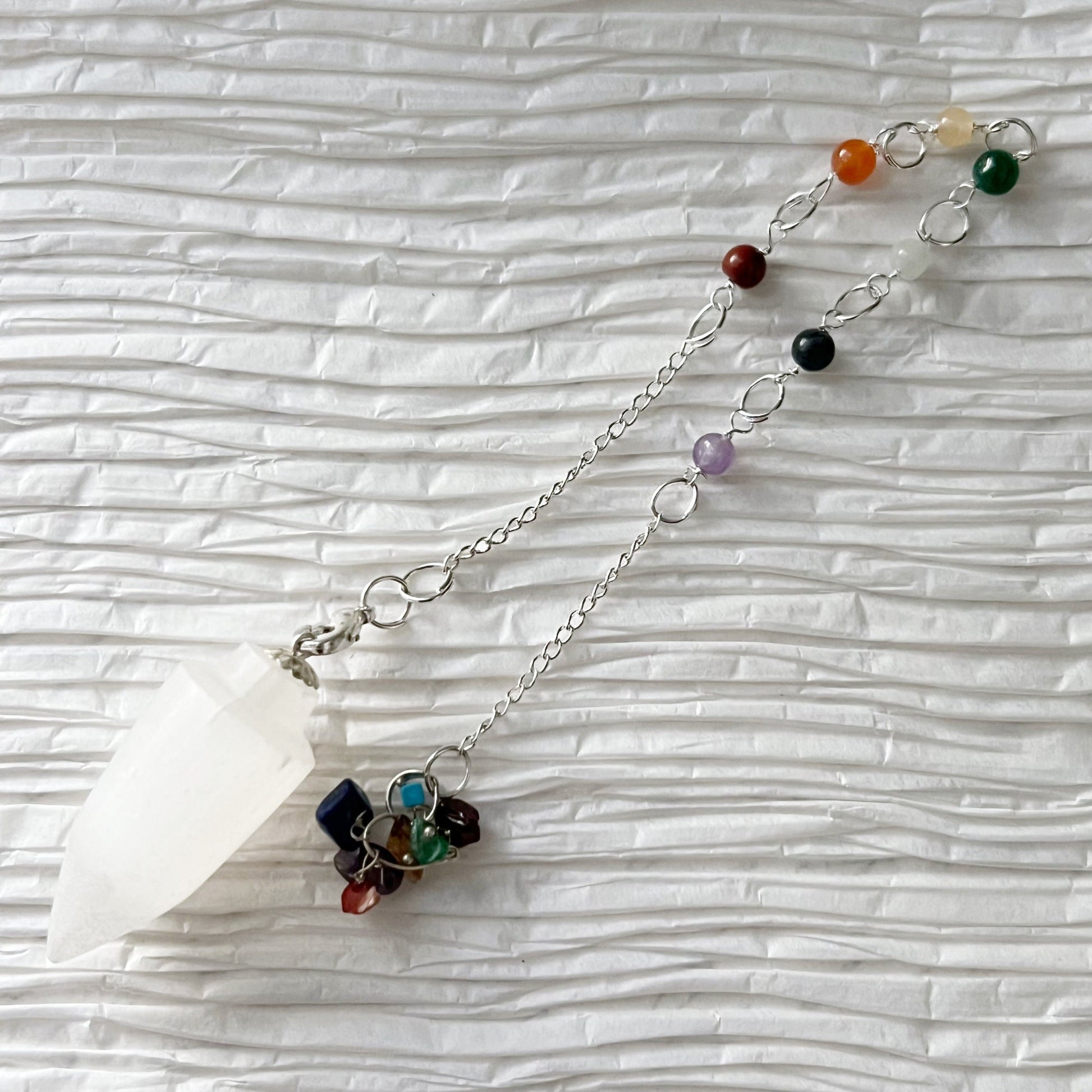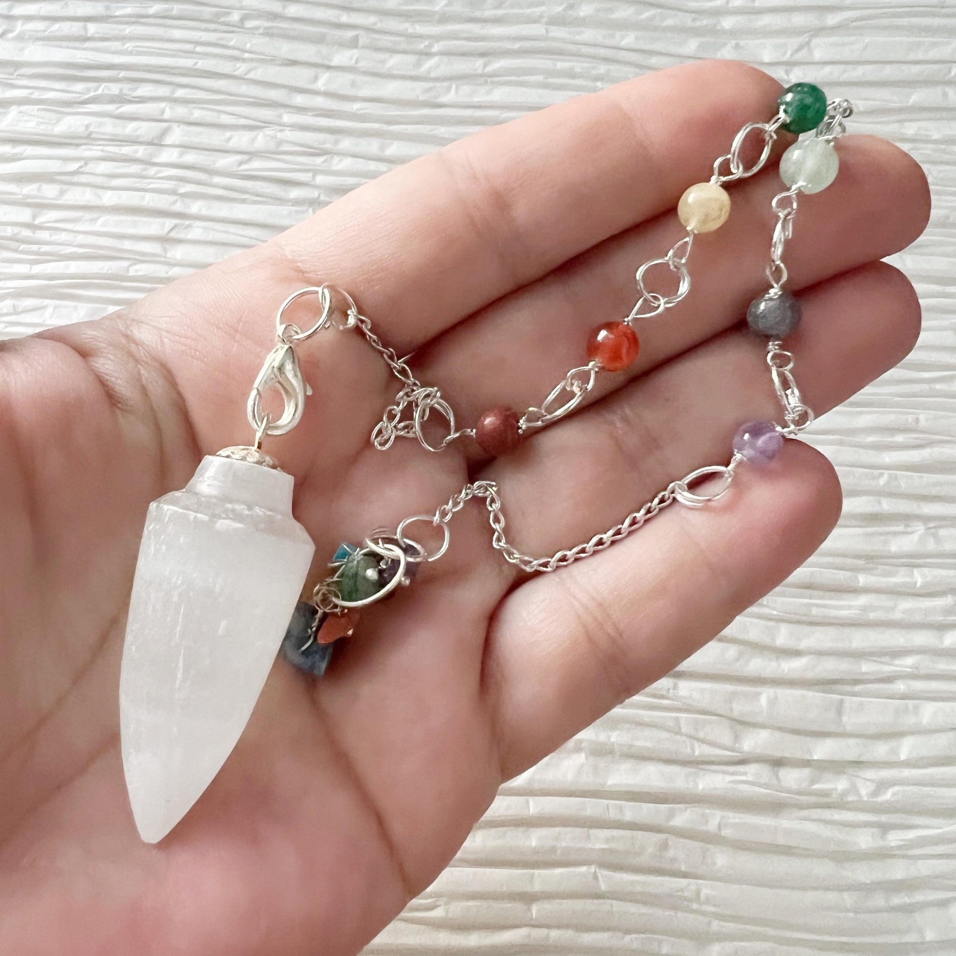 Elevate your spiritual practice with our Selenite Teardrop Pendulum. Each pendulum includes one hand-carved Selenite Crystal Pendulum in a teardrop shape, with a silver Chakra crystal chain featuring seven carefully selected gemstones: Amethyst, Iolite, Blue Aventurine, Dark Green Aventurine, Yellow Aventurine, Carnelian, and Red Jasper.