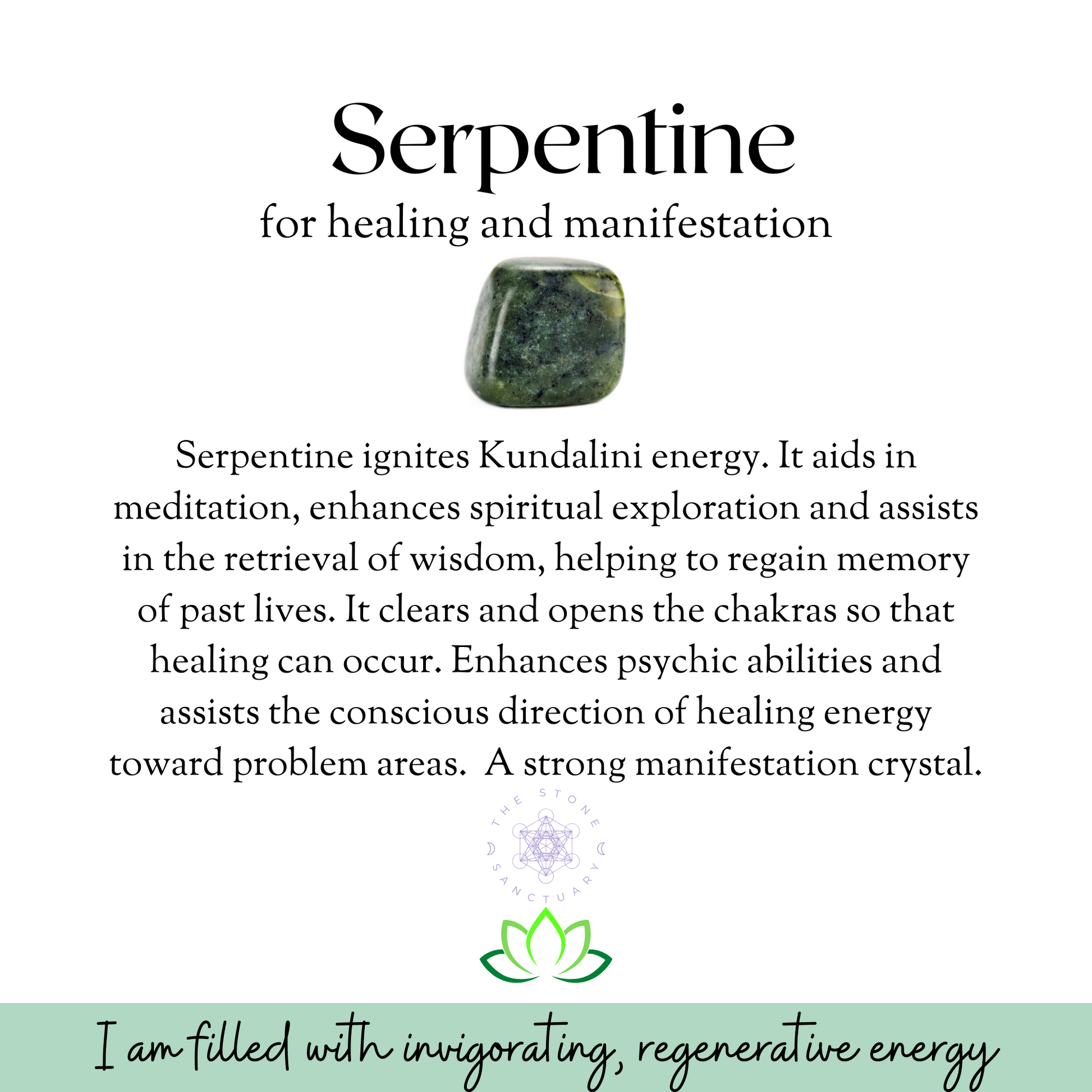 Serpentine can be used to attract what you want into your life abundance on all levels, prosperity, love, healing.