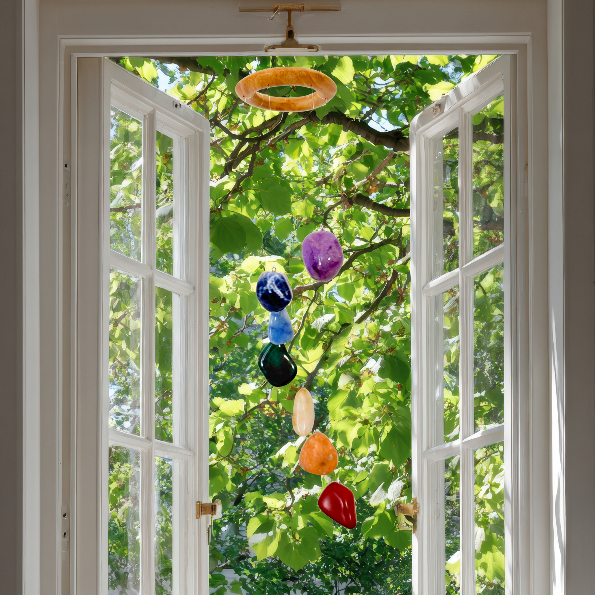 Each chime includes a thoughtfully selected blend of Red Jasper, Orange Aventurine, Yellow Aventurine, Green Aventurine, Blue Aventurine, Sodalite, and Amethyst, with stones sourced from Brazil. Measuring approximately 16–17 inches in length, this piece is fully assembled and ready to hang straight out of the box.