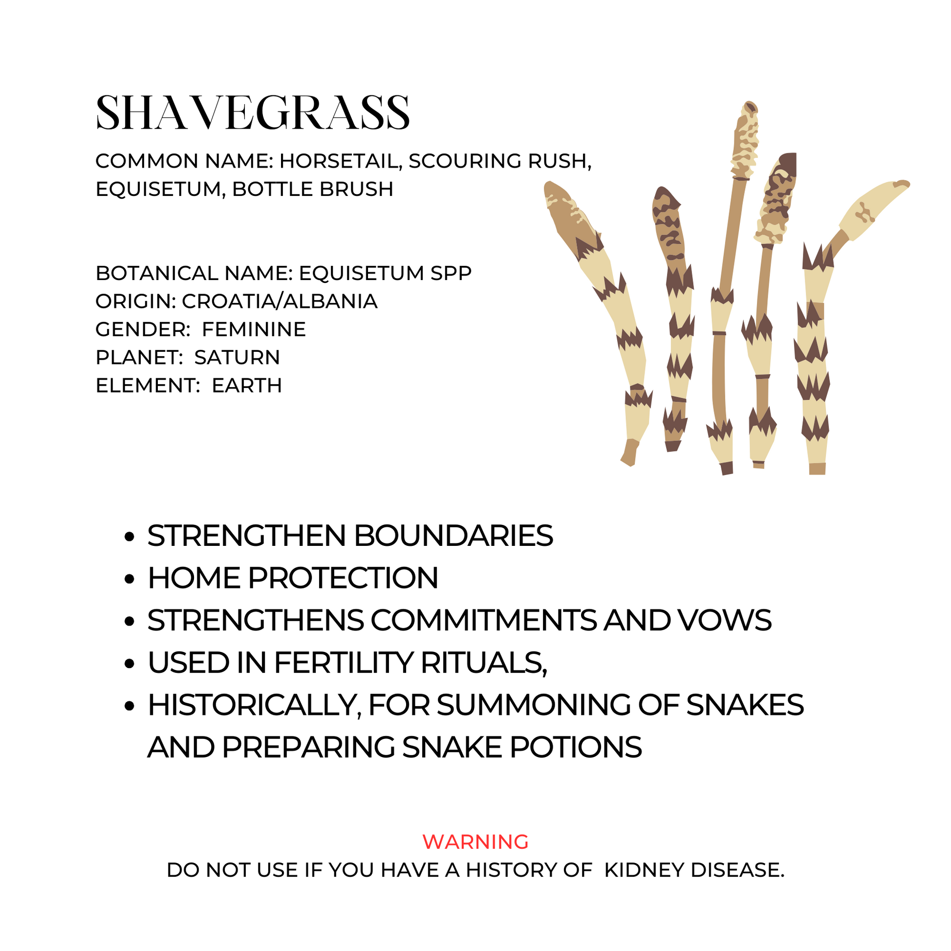 Horsetail, also known as Scouring Rush, Equisetum, or Bottle Brush, is an ancient herb that has been used for centuries in various cultures for its spiritual properties. Associated with the feminine energy, the planet Saturn, and the earth element. It is believed to strengthen boundaries, protect the home, and reinforce commitments and vows. Horsetail is also used in fertility rituals and has a historical use of being used in the preparation of snake potions.