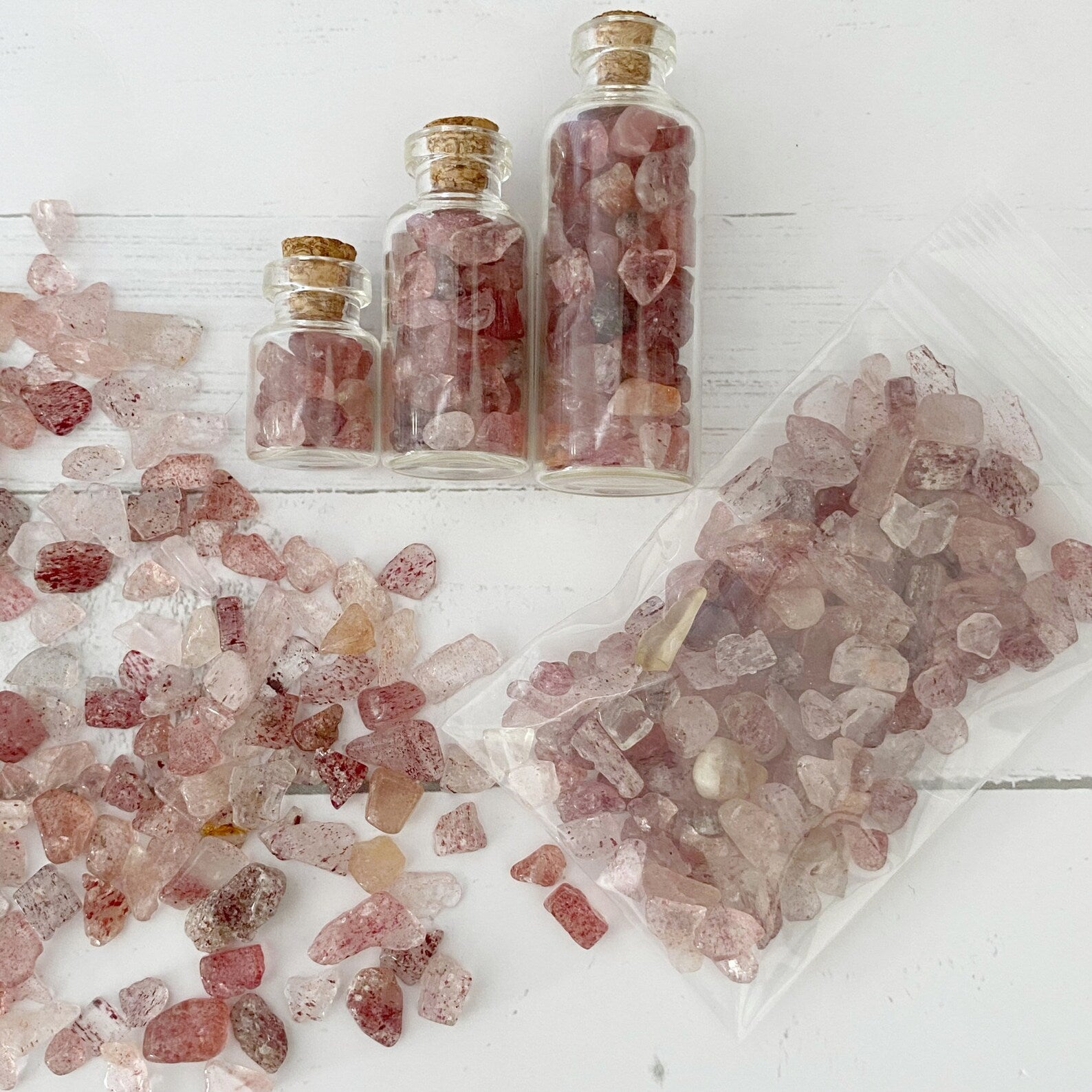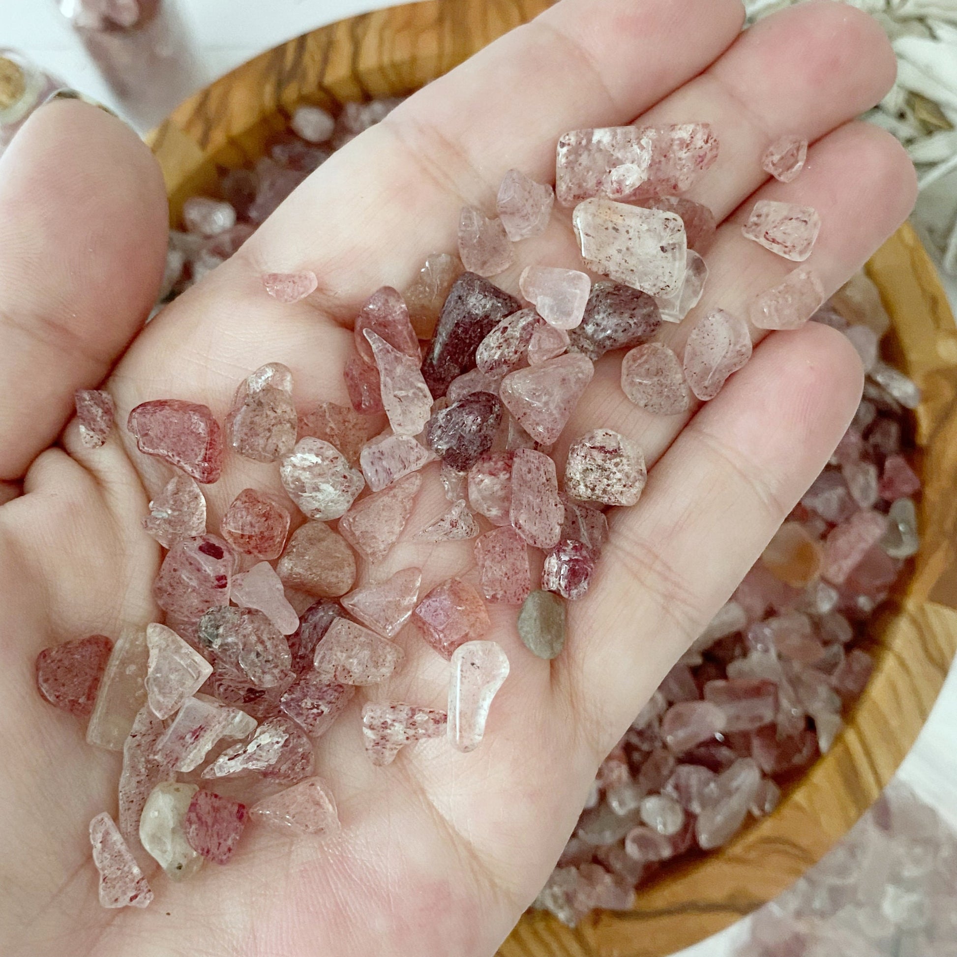 Strawberry Quartz Crystal Chips are tumbled and polished tiny stones. These mini stones are perfect for various creative and mystical endeavors. Whether you're into candle making, adding to your roller ball oils, crafting, or creating resin jewelry, these chips add a touch of natural energy to your projects. They're also ideal for spell jars, mojo bags, witch balls, orgone devices, and as sacred additions to your altar jars.