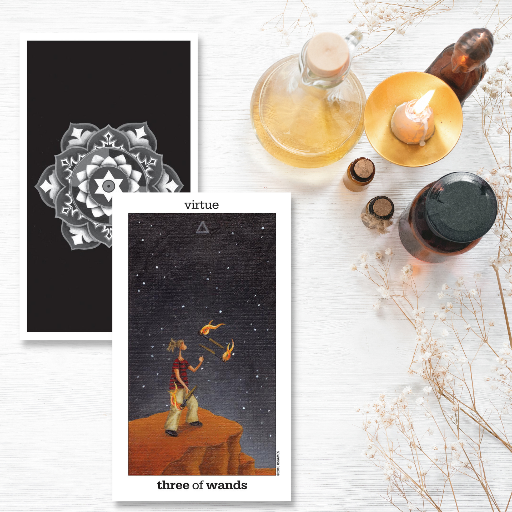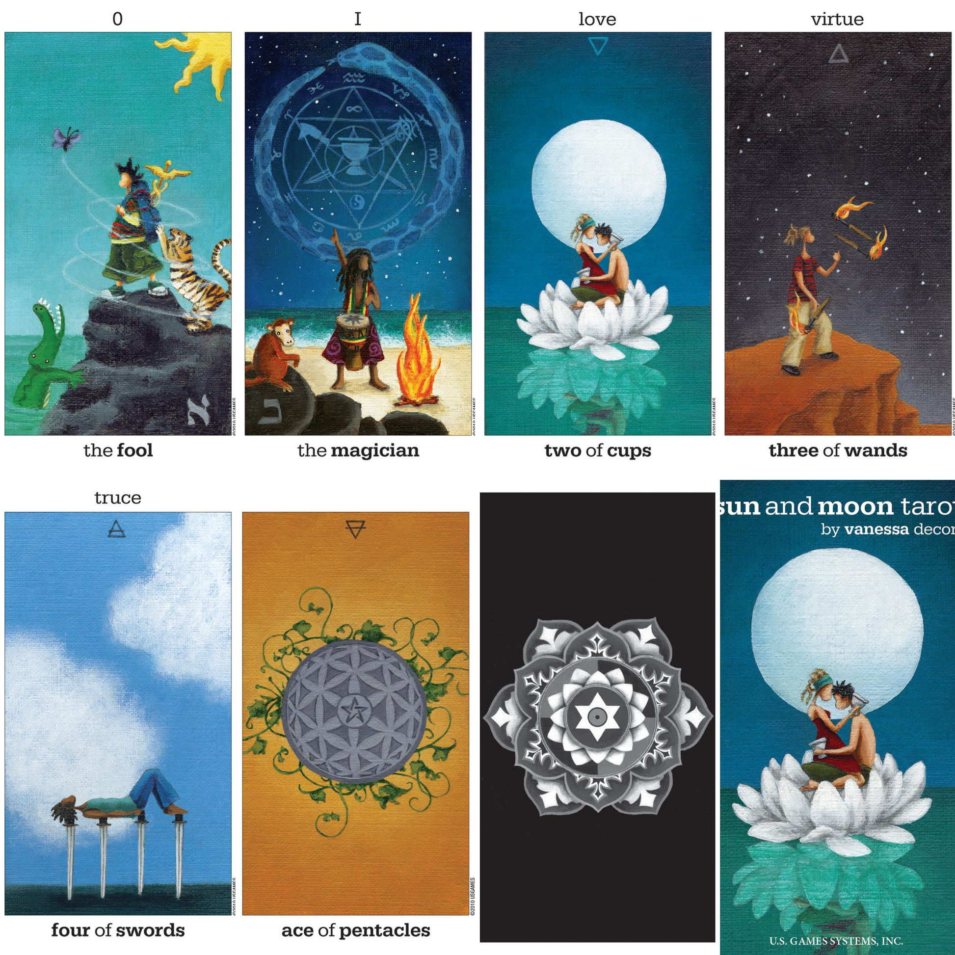 Sun and Moon Tarot is a multi-cultural tarot deck with symbolism borrowed from Hinduism, yoga, ancient Egyptian and classical Greek mythology, the I Ching, and Runes. The instruction booklet includes astrological associations and explanation of the Hebrew letters, as well as card meanings. Sun and Moon is a interesting and appealing tarot deck.