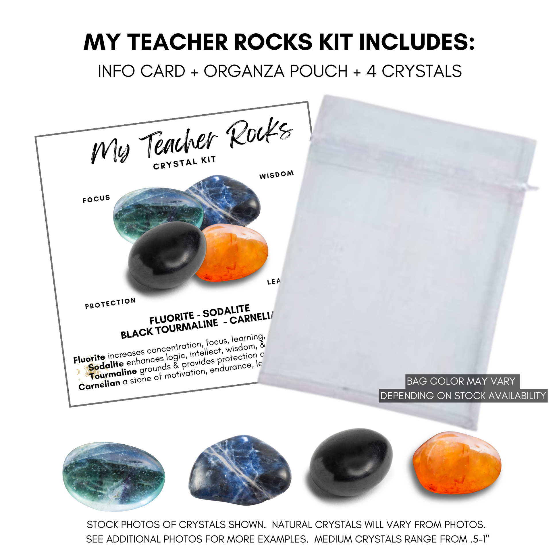 Show appreciation for your favorite educator with our "My Teacher Rocks" Crystal Kit, a thoughtful four-stone collection designed specifically for teachers. Perfect for supporting teachers in their important work, this set serves as both a token of gratitude and a tool for enhancing their educational environment.