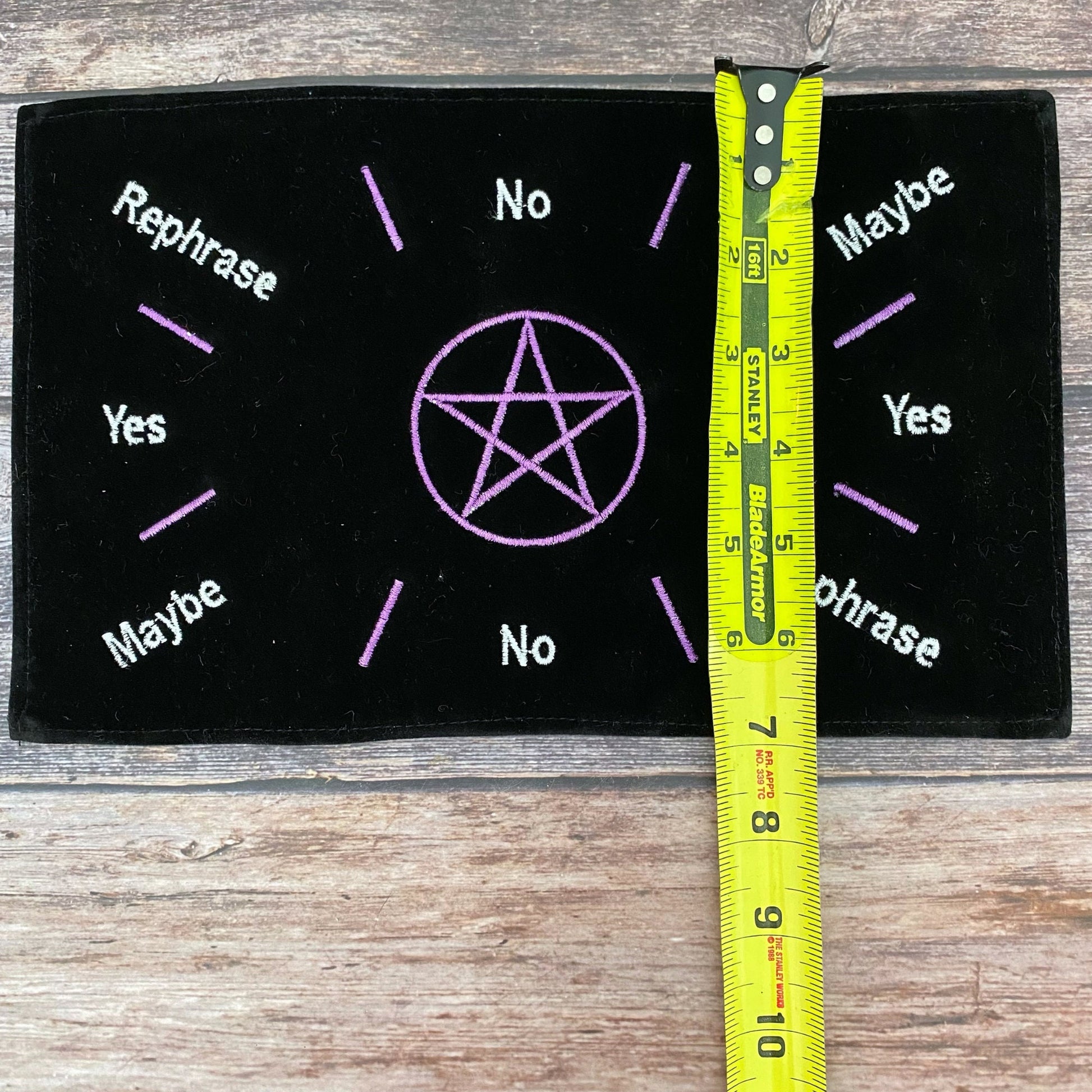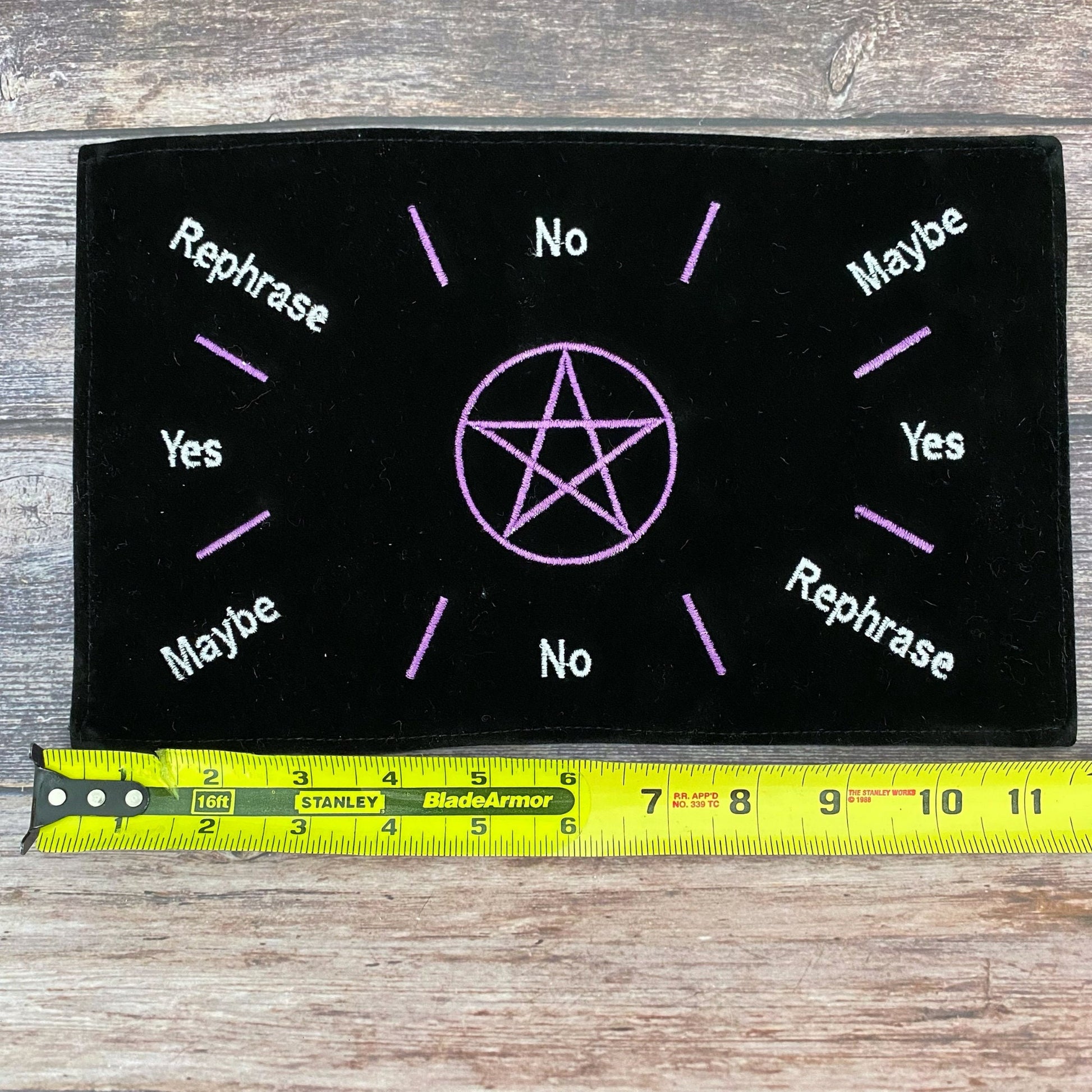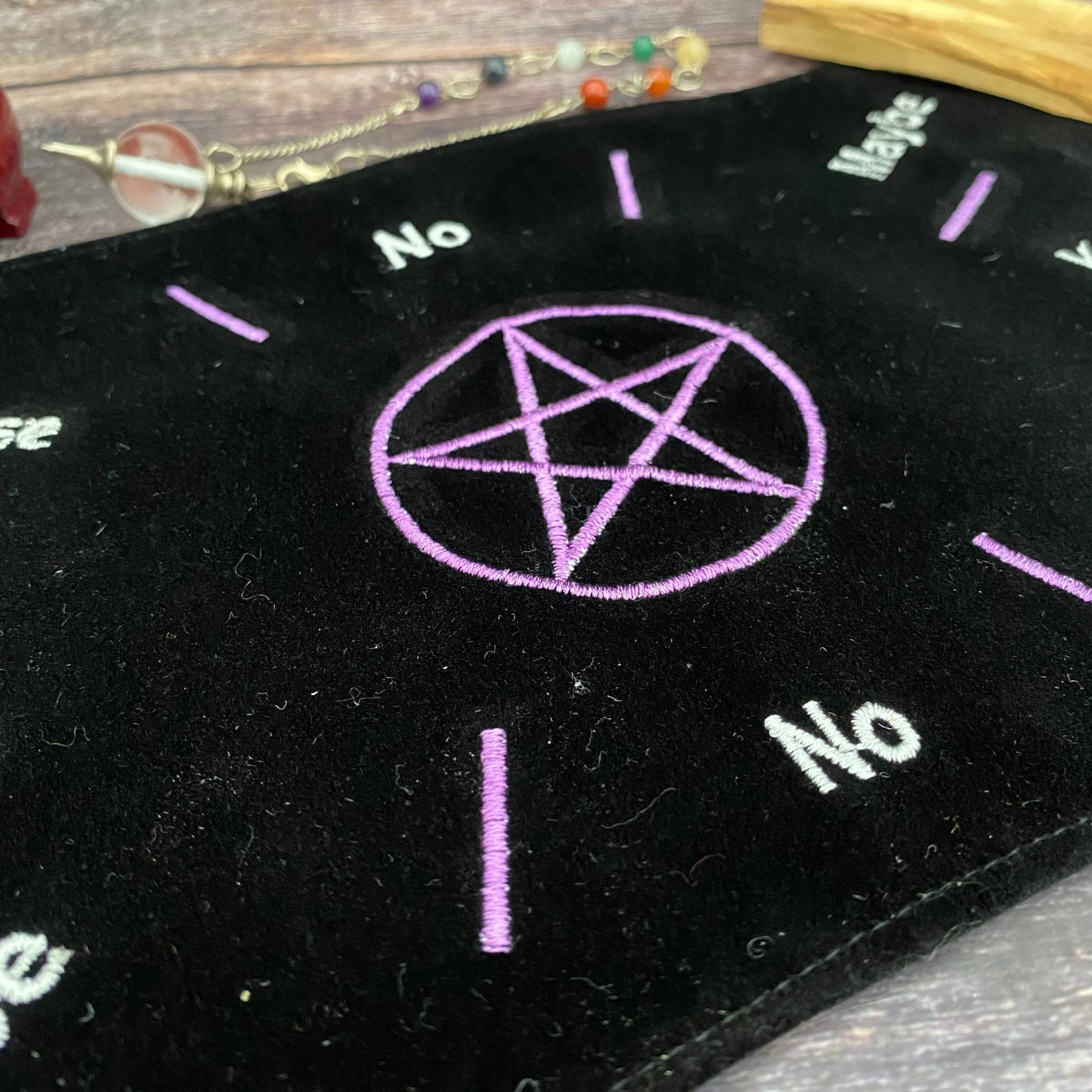 Elevate your divination practice with the elegant Black Velvet embroidered pendulum mat, a tool designed to enhance the clarity and depth of your pendulum readings. Measuring approximately 11.5" x 7", this mat provides the perfect surface for conducting pendulum dowsing sessions. As you pose your questions, the pendulum (sold separately) will swing toward specific answers indicated on the mat, offering guidance and insight. The luxurious black velvet material adds a touch of sophistication and serves as a smooth backdrop for your pendulum's movements, ensuring clear and undisturbed readings.