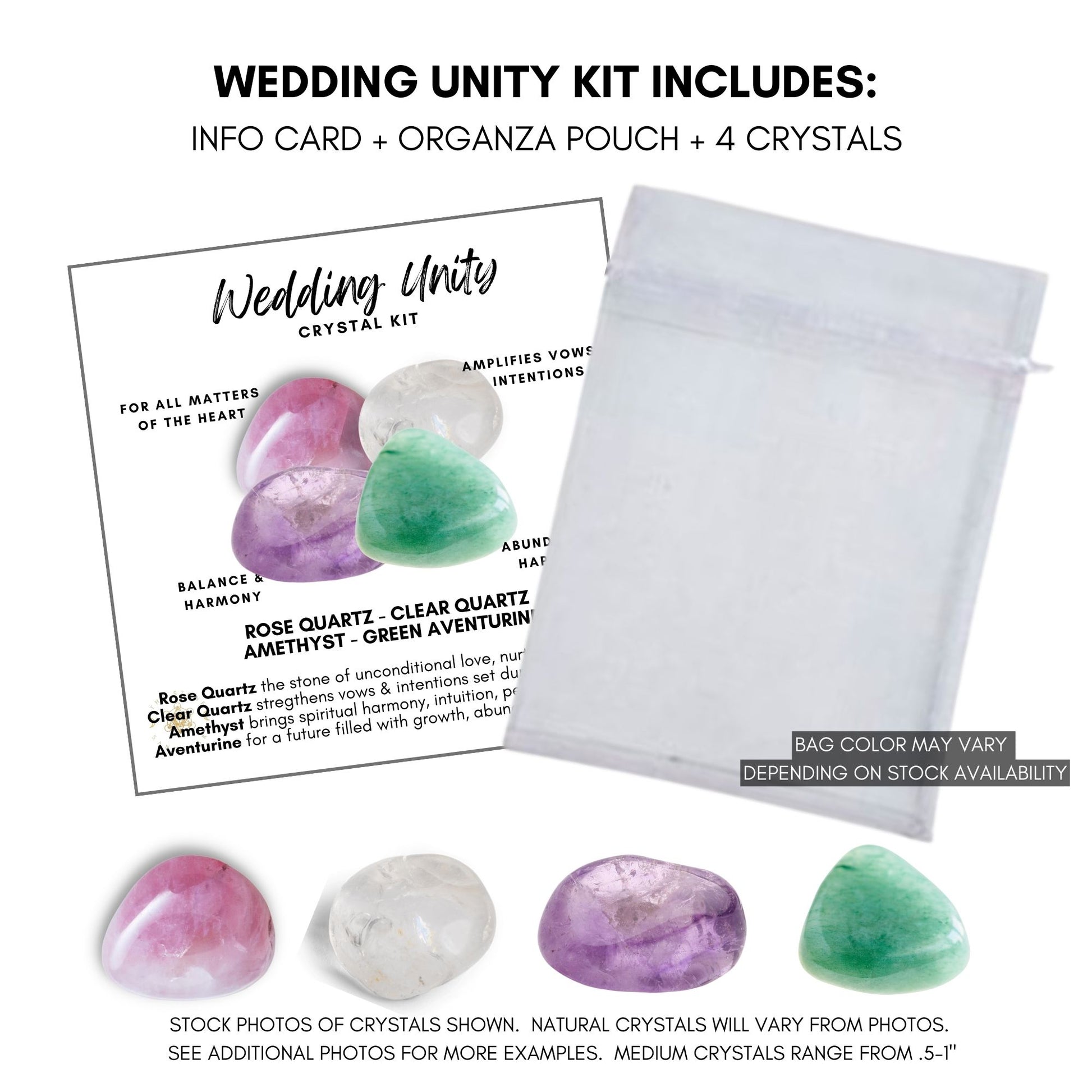 Celebrate and solidify your union with our Wedding Unity Crystal Kit, a beautifully symbolic four-stone set that includes Rose Quartz, Clear Quartz, Amethyst, and Green Aventurine.