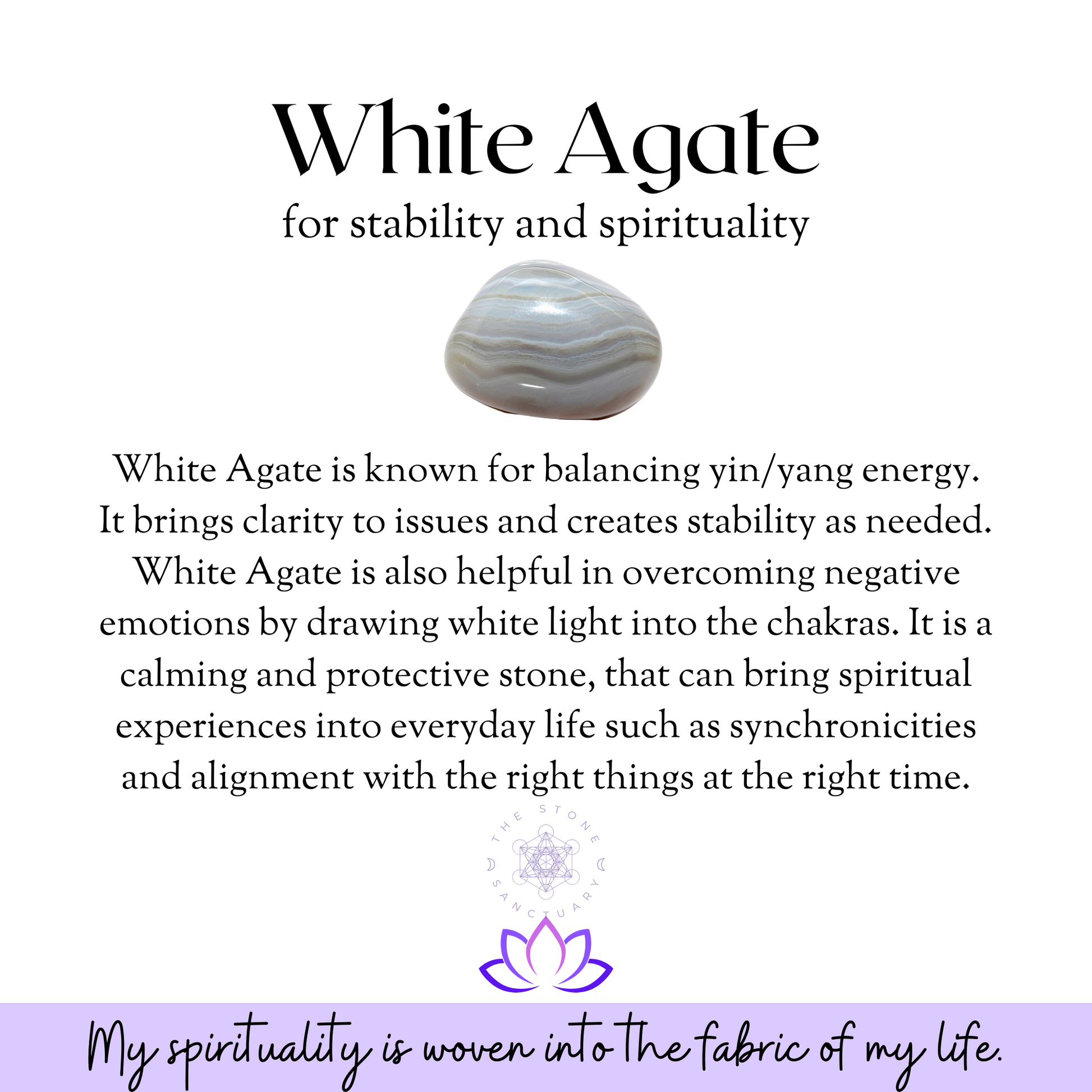 White Agate is known for helping balance yin/yang energy and it is a calming and protective stone. It is believed to improve mental functions and can help where issues of clarity and stability are concerned. White Agate is also helpful in overcoming negative emotions and enhances intuition. The milky whiteness of the stone brings good fortune and good energy in difficult situations. It can also help you avoid bad or harmful situations and instead bring new people into your life for the better.