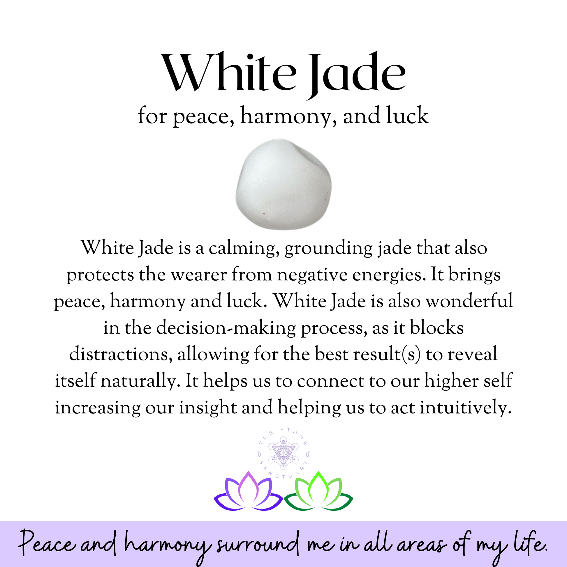 White Jade’s energy is peaceful, joyful and wonderfully practical. It gently encourages us to stop struggling so much and to step outside our ego’s perspective and see the bigger picture. White Jade gracefully leads us into internal harmony and helps bring our relationships and environment into balance with us.