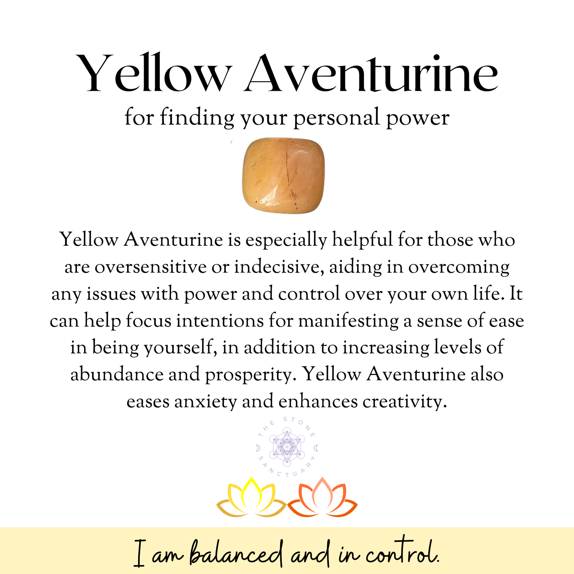 Yellow Aventurine opens and balances the Sacral and Solar Plexus Chakras. It is especially helpful for those who are oversensitive or indecisive, aiding in overcoming any feelings of problems with power and control over your own life. It can help focus intentions for manifesting a sense of ease in being yourself, in addition to increasing levels of abundance and prosperity. Yellow Aventurine also enhances creativity.