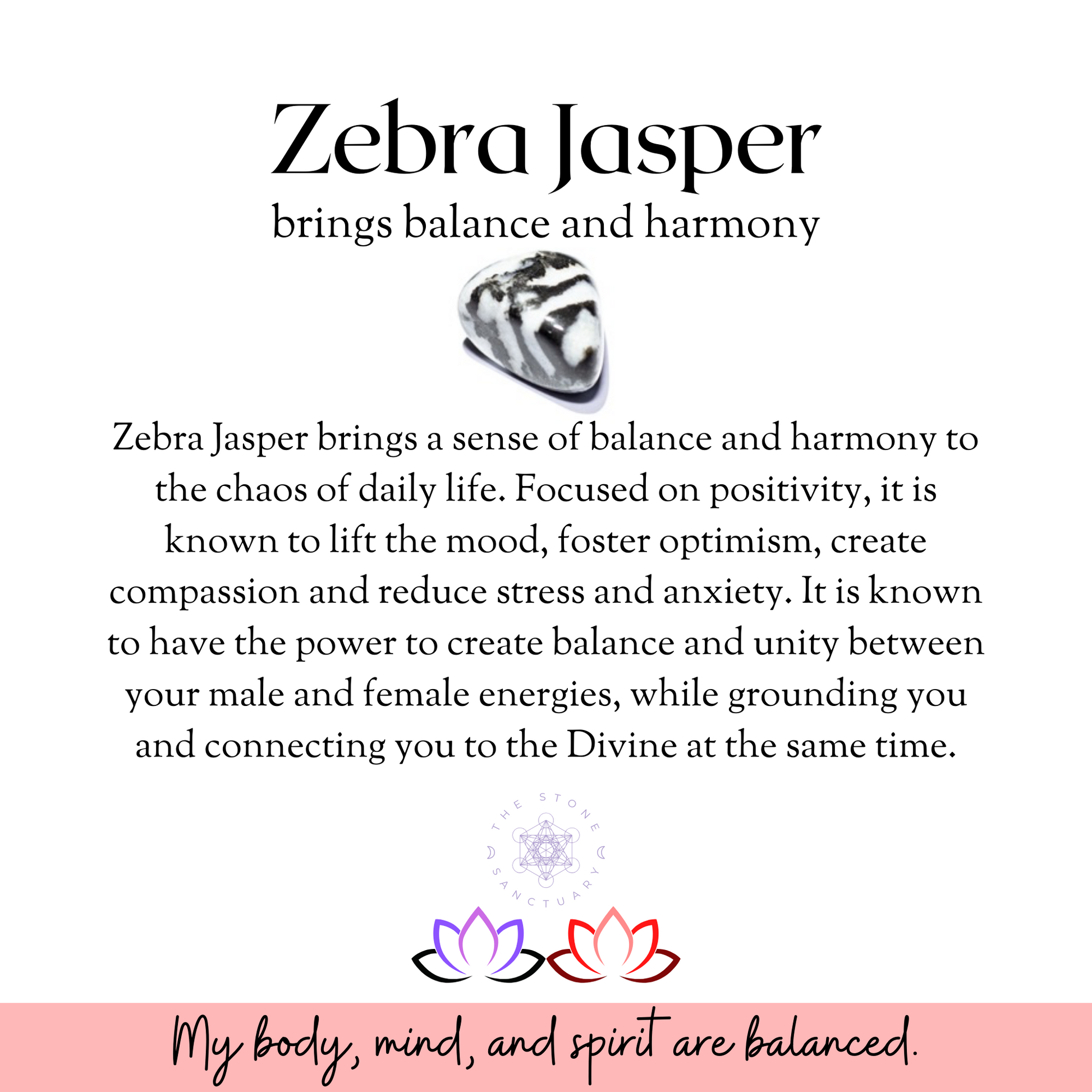 Welcome to our enchanting collection featuring Zebra Jasper, a mesmerizing stone that brings balance and harmony to the whirlwind of everyday life. With its captivating black and white stripes, Zebra Jasper radiates positivity, uplifts the spirit, and instills a sense of optimism. It is a crystal renowned for fostering compassion, reducing stress, and alleviating anxiety, allowing you to navigate life's challenges with grace and tranquility.